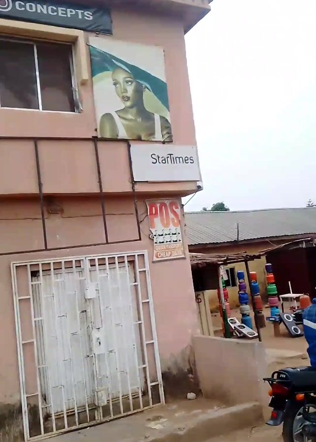 man on a motorcycle riding down a dirt road in a neighborhood. The motorcycle is black with silver accents. The man is wearing a blue jacket and brown pants. He is riding away from the camera. On the left side of the road is a building with a StarTimes sign and a POS sign. There is a metal grate door on the building. Next to the building is a stall selling colorful buckets. There is a sign for Triple J+ Company visible on the right side of the road. The video is shot from a slightly elevated position. The sky is overcast.