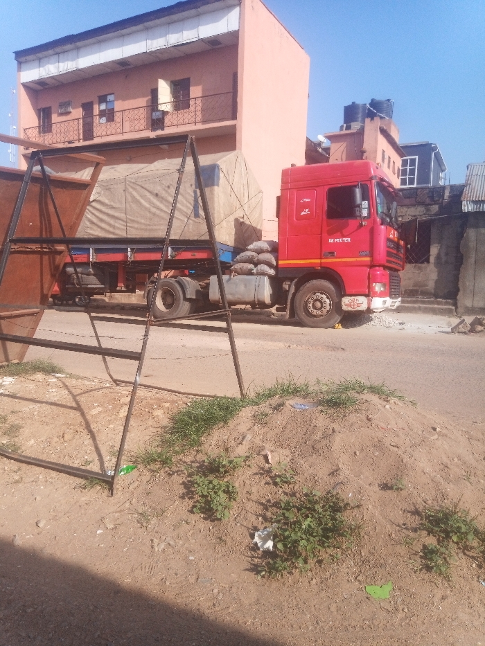 The image depicts a static scene in Dadi Riba, Nigeria, featuring a large red semi-truck parked on the right side of a paved road under clear blue skies. The truck's tractor unit is red with "DE PEUTER" visible on the cab door, and several gray bags are stacked on its side between the cab and the trailer. The attached trailer carries a substantial, rectangular object covered by a light-colored tarpaulin, secured by ropes. In the background, a two-story building with an orange-peach facade and a white upper roof structure stands prominently. This building features multiple windows and a first-floor balcony with an iron railing. To its right, other buildings are visible, including one with a black water tank on its roof and another with a distinctive white-framed window. The immediate foreground consists of a dirt and gravel patch with a small mound of earth sparsely covered in green grass and weeds, along with minor litter. A dark metal A-frame structure, possibly a part of a temporary enclosure or stand, occupies the lower left and central foreground. No individuals are present in the visible frame.