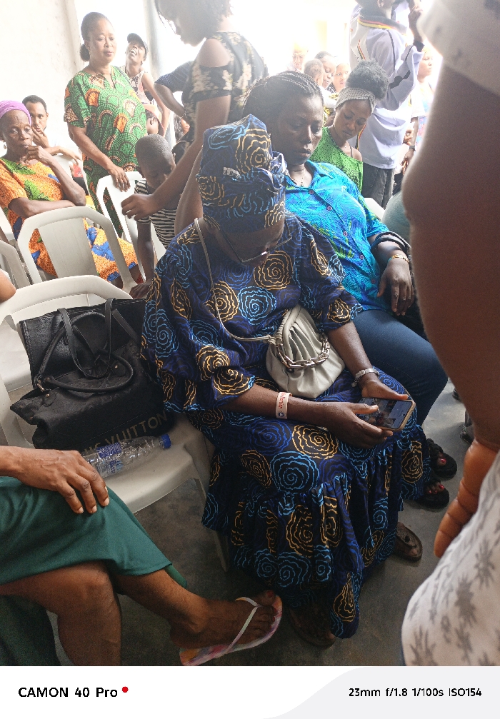 The image depicts an indoor gathering of approximately ten to fifteen individuals, primarily women, within an unidentified space in Unknown, Unknown. The setting features light-colored walls and a grey floor, with white plastic chairs arranged for seating. In the foreground, a dark-skinned woman sits facing the viewer, wearing a dark blue dress with yellow and light blue circular patterns and a matching headwrap. She wears glasses, a light-colored wristband, and a small light grey purse with a silver chain strap across her body. She holds a dark smartphone in both hands, looking down at the screen. Her feet are in dark sandals. To her left, a black tote bag with "LOUIS VUITTON" visible lettering and a clear plastic water bottle rest on an empty white plastic chair. Partially visible in the extreme foreground left are the legs and right hand of another dark-skinned person wearing a green garment and multi-colored flip-flops. Behind the central seated woman, another dark-skinned woman is seated, wearing a bright blue button-up shirt and dark jeans, with a silver-colored bracelet on her right wrist. In the mid-ground, several individuals stand and sit. This includes an older dark-skinned woman in an orange and green patterned top and a light headwrap, seated to the left, looking away. A standing dark-skinned woman in a green and orange patterned top is visible next to a white chair. A young child in a striped shirt stands between individuals. Further background shows more people, some standing, some partially obscured, including a person in a dark patterned off-shoulder top and another in a white and black striped garment. The overall environment suggests a casual social or community assembly.