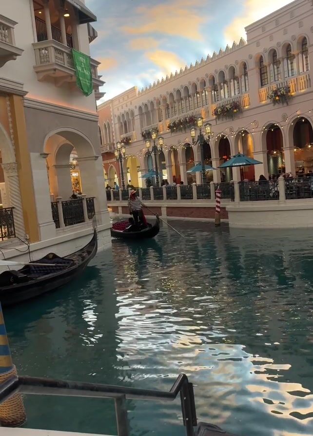 replica of a Venetian canal inside a building. A gondolier wearing a striped shirt and hat steers a gondola along the canal. Other gondolas are moored alongside the canal. Buildings with arched windows and balconies line the canal. The ceiling is painted to resemble a sky with a sunset. Outdoor seating areas for restaurants are visible along the canal.
