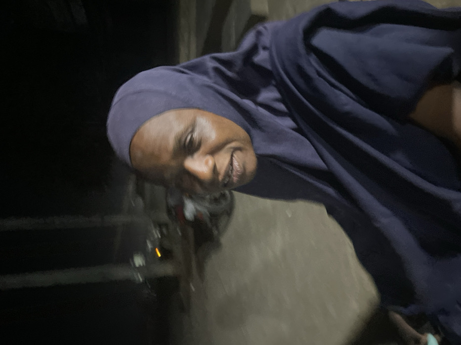 An individual with dark skin, partially covered by a dark blue headscarf and garment, smiles gently. The scene appears to be dimly lit, potentially at night. In the background, out of focus, a motorcycle or scooter is visible along with some stairs. The person's face is the main focus, with the surrounding environment adding context.