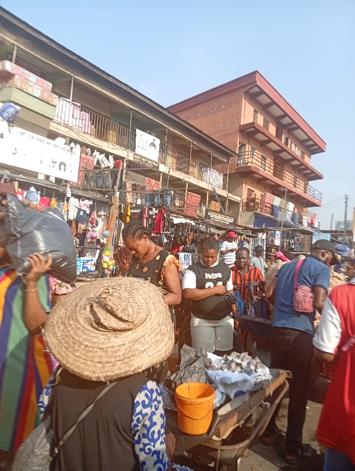 A bustling market scene unfolds under a clear sky. Several people are present, including one wearing a large straw hat. Buildings with multiple levels line the background, their balconies displaying wares. Clothing and goods hang from the structures, creating a vibrant tapestry of commerce. A wheelbarrow filled with items sits in the foreground, along with a small orange bucket. The atmosphere is lively and full of activity.