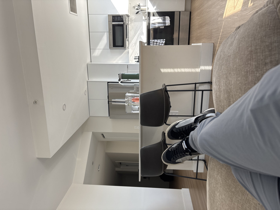 The image displays an interior scene of a modern apartment or condominium kitchen and adjacent living area, presumed to be located in Boston, United States. The perspective is low, from a seated position on a light brown textured couch. In the immediate foreground, the legs, clad in light blue-grey pants, and feet, wearing black and white sneakers, of an individual are visible, resting on the couch. The midground features a white kitchen island with a light-colored countertop. Two dark grey bar stools with black metal frames are positioned underneath the island. On the island, a clear pitcher containing water and an orange-colored object, a second clear carafe, and a dark green insulated water bottle are present. The background reveals a contemporary kitchen characterized by white flat-panel cabinetry. Stainless steel appliances include a French door refrigerator, an over-the-range microwave, and an electric range with a black and white striped kitchen towel draped over its handle. A light-colored tile backsplash is visible behind the range. The ceiling is white with recessed lighting and a smoke detector/fire alarm. Sunlight streams into the room from an unseen window, casting distinct vertical shadows across the kitchen island and onto the light-toned hardwood flooring. To the left of the kitchen, a brightly lit hallway with white walls and additional recessed lighting extends into the distance.