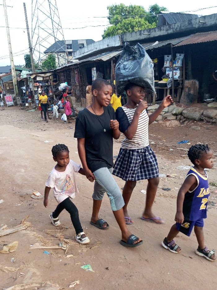 The image depicts a daytime street scene in Onitsha, Nigeria, featuring a group of four individuals walking on an unpaved, dusty road strewn with debris. In the foreground, from left to right: 1. A young girl with braided hair, wearing a light-colored t-shirt with a graphic, black leggings, and white sandals. She holds the hand of the individual to her right. 2. An older girl or young woman with short hair, wearing a black short-sleeved t-shirt, light grey capri pants with light blue trim, and dark slides. She is smiling and looking left. 3. An older girl or young woman with short hair, wearing a white and black striped short-sleeved top with sheer black sleeves, a blue plaid skirt, and light-colored flip-flops. She balances a large black plastic bag on her head with her left hand raised slightly, and is smiling while looking right. 4. A young child, possibly a boy, with braided hair, wearing a purple basketball jersey (Lakers #2), dark shorts, and dark sandals. He walks independently to the right of the group. The background reveals a bustling street lined with single-story market stalls or shops constructed primarily with corrugated metal roofs and various materials. Goods are visible inside and outside some stalls. Further back and to the left, a tall metal electricity transmission tower is prominent. A multi-story building with a dark roof is visible behind the market structures. Several other people, including adults and children, are present in the mid-ground among the stalls. The sky above is overcast, and green foliage is visible above the buildings.