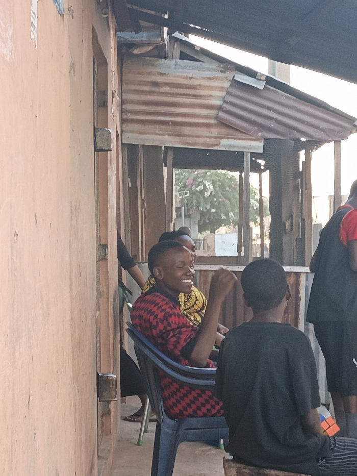 This image depicts an outdoor scene in Gwagwarwa, Nigeria, featuring multiple individuals near a rudimentary structure. On the left, a plain light-orange wall constitutes the frame's boundary. To the right, a stall or enclosure is constructed from rusted corrugated metal sheets and wooden supports, framing an opening. Through this opening, green foliage with white and pink flowers is visible under a bright sky. In the mid-ground, a young male with short dark hair, wearing a red and black checkered shirt, is seated on a blue plastic chair, oriented towards the right. He exhibits a broad smile, with his right hand slightly elevated. Partially obscured behind him is another individual wearing a yellow patterned garment. In the immediate foreground, a young male, viewed from the back, is seated on a low wooden stool. He wears a black t-shirt and striped pants, holding a Rubik's Cube in his left hand. To the far right, partially visible, another individual stands, wearing a black vest over a red shirt and black shorts.