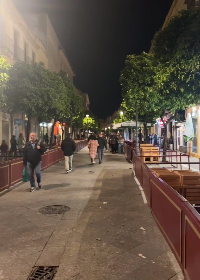 The video captures a nighttime scene in what appears to be a bustling pedestrian street