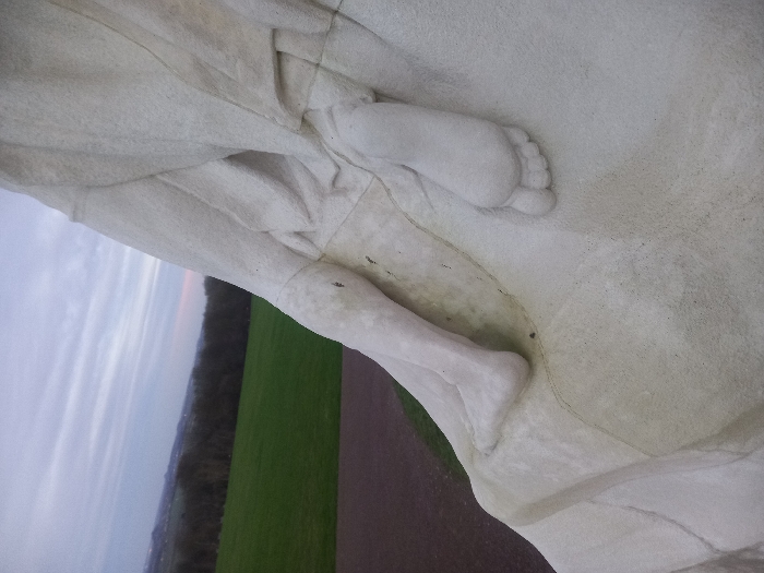 A close-up captures a white stone statue's legs and feet, draped with fabric. The statue overlooks a landscape with a clear sky transitioning into a forest and a green field, separated by a pathway. The statue's textured surface contrasts with the smooth background elements. The image appears slightly rotated.