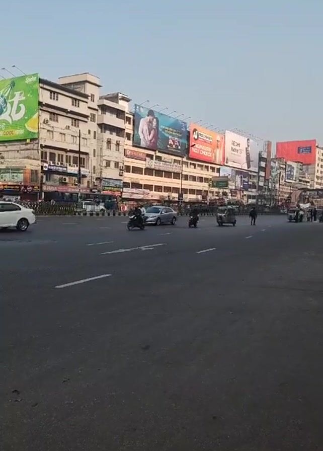 wide street scene in a city. The street is paved and has white lines indicating lanes. There are several vehicles on the road including cars, motorbikes, and auto rickshaws. Buildings line the street, adorned with multiple large billboards advertising various products and services. The sky is a clear light blue. There are a few people walking on the far side of the street, but the road itself is mostly empty. The video is stable, offering a clear view of the urban landscape.