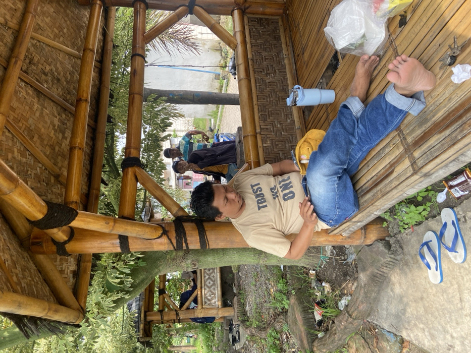 A man reclines on a bamboo structure. He wears a tan t-shirt with the text "Trust One" and blue jeans. Beside him are a water bottle and a yellow jacket. In the background, several people stand near a building. White and blue flip-flops sit on a concrete surface nearby. Bamboo construction is visible in the foreground and background. The structure appears to be outdoors, surrounded by foliage.