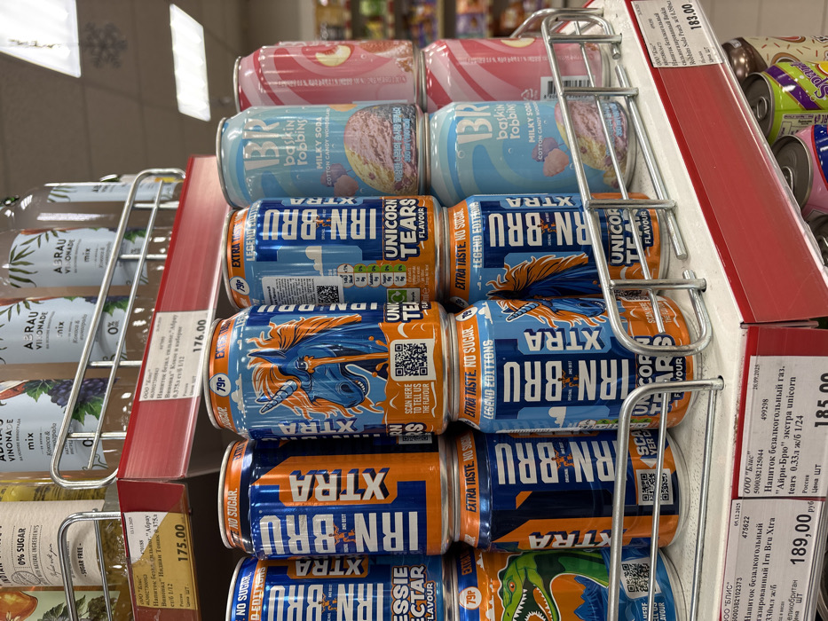 The image displays a well-lit retail beverage display within a store located in Ust-Ilimsk, Russia