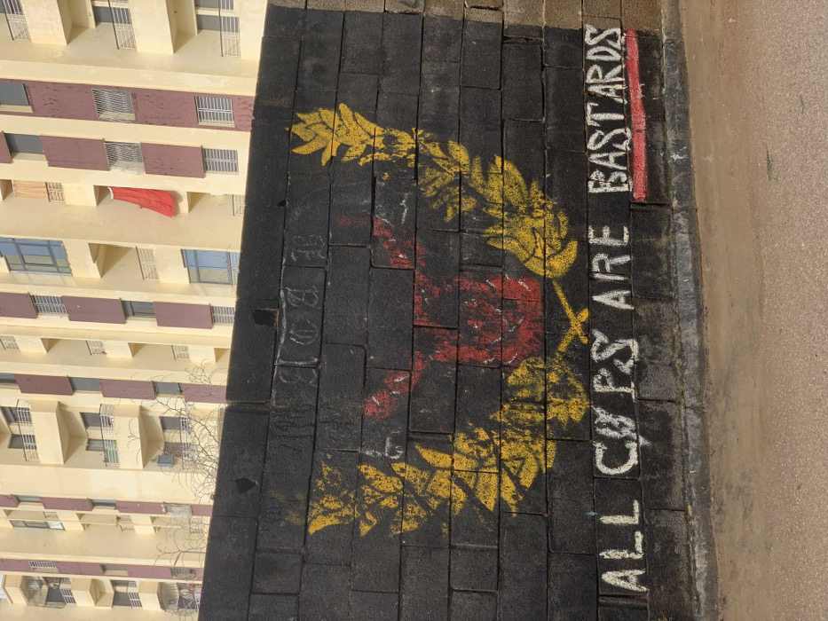 The image displays a dark grey cinder block wall situated in Ouislane, Morocco, covered with graffiti. A stylized emblem in red and yellow is painted centrally on the wall, featuring a red shield-like shape flanked by yellow laurel wreaths. Below this emblem, two yellow crossed objects, resembling swords, are visible. Above the main graffiti, the letters "ACAB" are faintly discernible in a Gothic script. Below the central design, the phrase "ALL COPS ARE BASTARDS" is written in white capital letters, with the word "BASTARDS" underlined in red with a thin black stripe. The wall exhibits surface irregularities and paint drippage. In the background, a multi-story residential building with a light yellow/beige facade and prominent brown vertical paneling is visible, featuring multiple balconies with metal railings and numerous windows. A bright red piece of fabric hangs from a balcony railing on an upper floor. Barbed wire and a sparse, bare-branched tree are visible above the wall, partially obscuring the lower section of the background building. The immediate foreground consists of a light brown paved surface leading to the base of the wall.