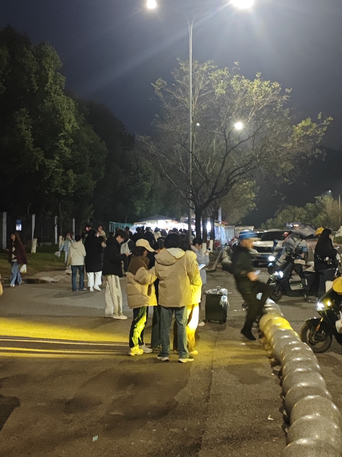 The image depicts a nighttime scene in the Shapingba District, China, characterized by artificial illumination and a gathering of individuals along a road