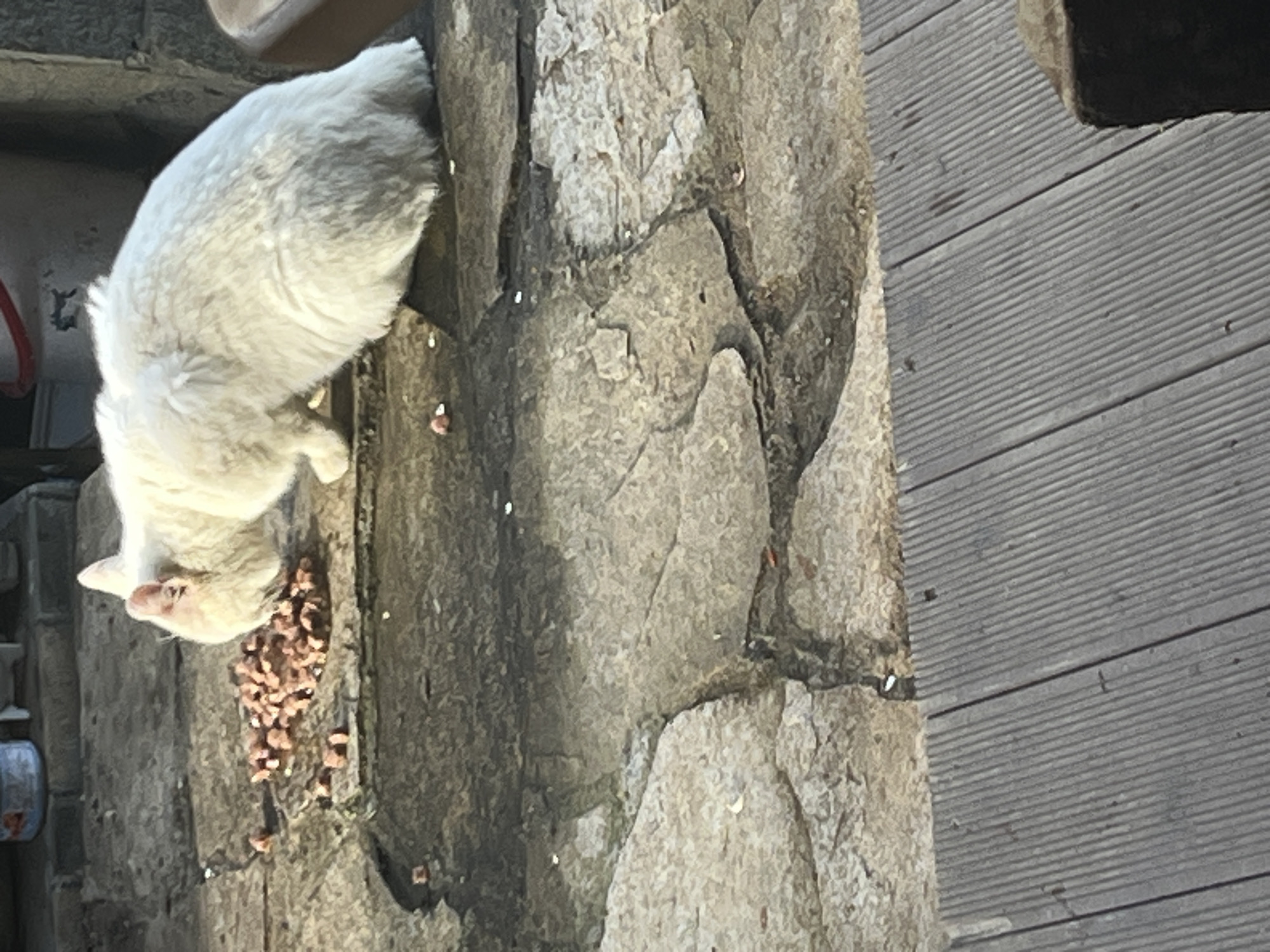 - "A white cat is eating food scattered on a stone surface" by FM-09WuJ2, licensed under CC BY 4.0