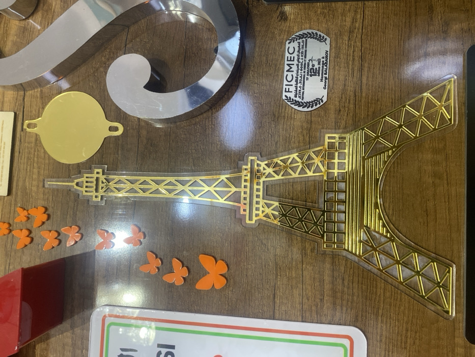 The scene depicts various decorative objects and a plaque displayed on a dark brown wooden surface, indicative of an indoor setting within the city of Meknes, Morocco. A two-dimensional, golden-colored replica of the Eiffel Tower, constructed from a metallic or acrylic material over a clear base, is centrally positioned. Approximately twelve small, orange, three-dimensional butterfly decals are arranged diagonally upwards to the left of the Eiffel Tower replica. To the right, partially visible, are sections of large, reflective, silver-colored metallic letters. A silver-toned rectangular plaque is located below these letters and to the right of the Eiffel Tower's base, bearing etched text including "FICMEC," "12 EDITION 2023," and "HOMMAGE A GEORGI BALABANOV," confirming an association with the International Film Festival of Meknes. Further elements include a small, golden, circular object with two attachment points situated above the Eiffel Tower replica, a corner of a solid red rectangular object in the upper-left, and a partial white sign with green and red borders displaying Arabic script and the partial word "SI" in the lower-left quadrant.