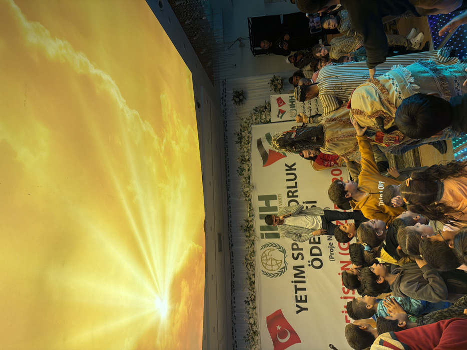 The image depicts an indoor event taking place in Unknown, Gaza City, characterized by a stage with a backdrop and a large audience, primarily children, in the foreground. The ceiling features a large illuminated display resembling a vibrant orange and yellow sunset or sunrise with prominent light rays emanating from the left. On the stage, a young man with dark hair, wearing a striped shirt and dark pants, stands centrally, holding a microphone to his mouth, suggesting he is speaking or performing. To his right, two individuals are engaged in a performance while wearing elaborate, traditional-style costumes. One costume features a dark, ornate headpiece with tassels and a patterned, fringed garment. The other performer, partially visible, wears a striped outfit and a cap, appearing to interact with the first costumed figure. The stage backdrop is a white banner displaying the green logo of "IHH İNSANİ YARDIM VAKFI" and text in Turkish: "YETİM SPONSORLUK ÖDEMESİ" (Orphan Sponsorship Payment) and partially visible "FİLİSİN (GAZE..." (Palestine (Gaza...)). A Turkish flag is visible on the left side of the banner, and a Palestinian flag on the right. White floral garlands adorn the top edge of the banner. In front of the stage, a dense crowd of children, ranging in age from approximately 5 to 15 years old, occupies the foreground. Many children are looking up at the stage, with expressions of curiosity and engagement. One boy in a yellow hoodie is seen extending his arm towards the costumed performers. In the mid-ground and background, adults are visible, some standing and observing the event, with one individual in the far background holding a mobile phone, potentially recording. The overall atmosphere appears to be one of an organized community gathering or celebration.