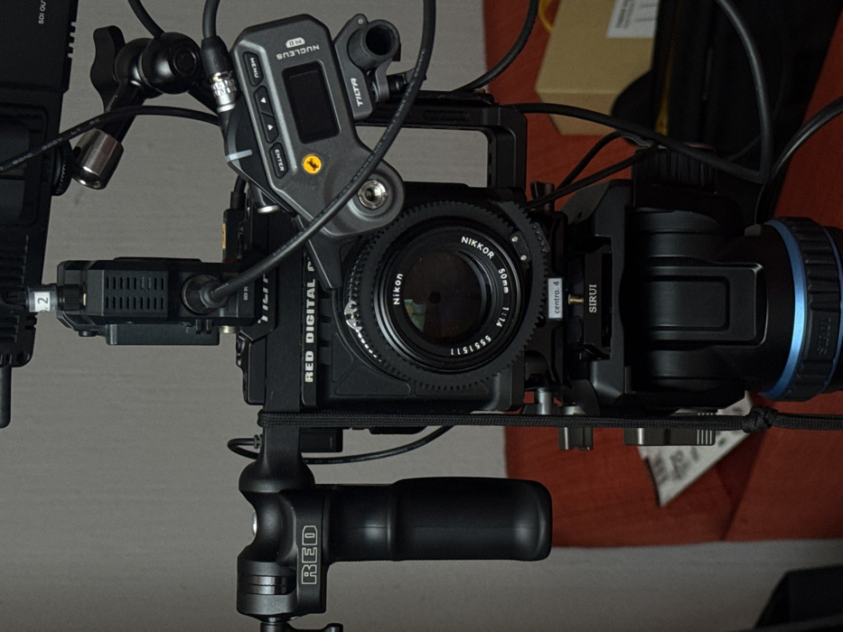A RED digital camera is equipped with a Nikon Nikkor 50mm f/1.4 lens. A Tilta Nucleus M unit is mounted near the camera's body, with cabling connected. A Sirui Centro 4 device is visible on the lens. The camera is attached to a RED grip and tripod mount. Other accessories and cabling are present. The lens serial number is 5551511.