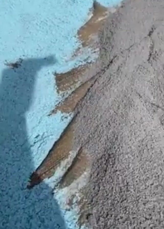 This video shows grey rice drying on a blue tarp. The tarp is on the ground and there is sand visible underneath. A person in a floral patterned dress walks past the tarp. The rice has been spread out to dry in patterns on the tarp. The camera is pointed at the ground from above.