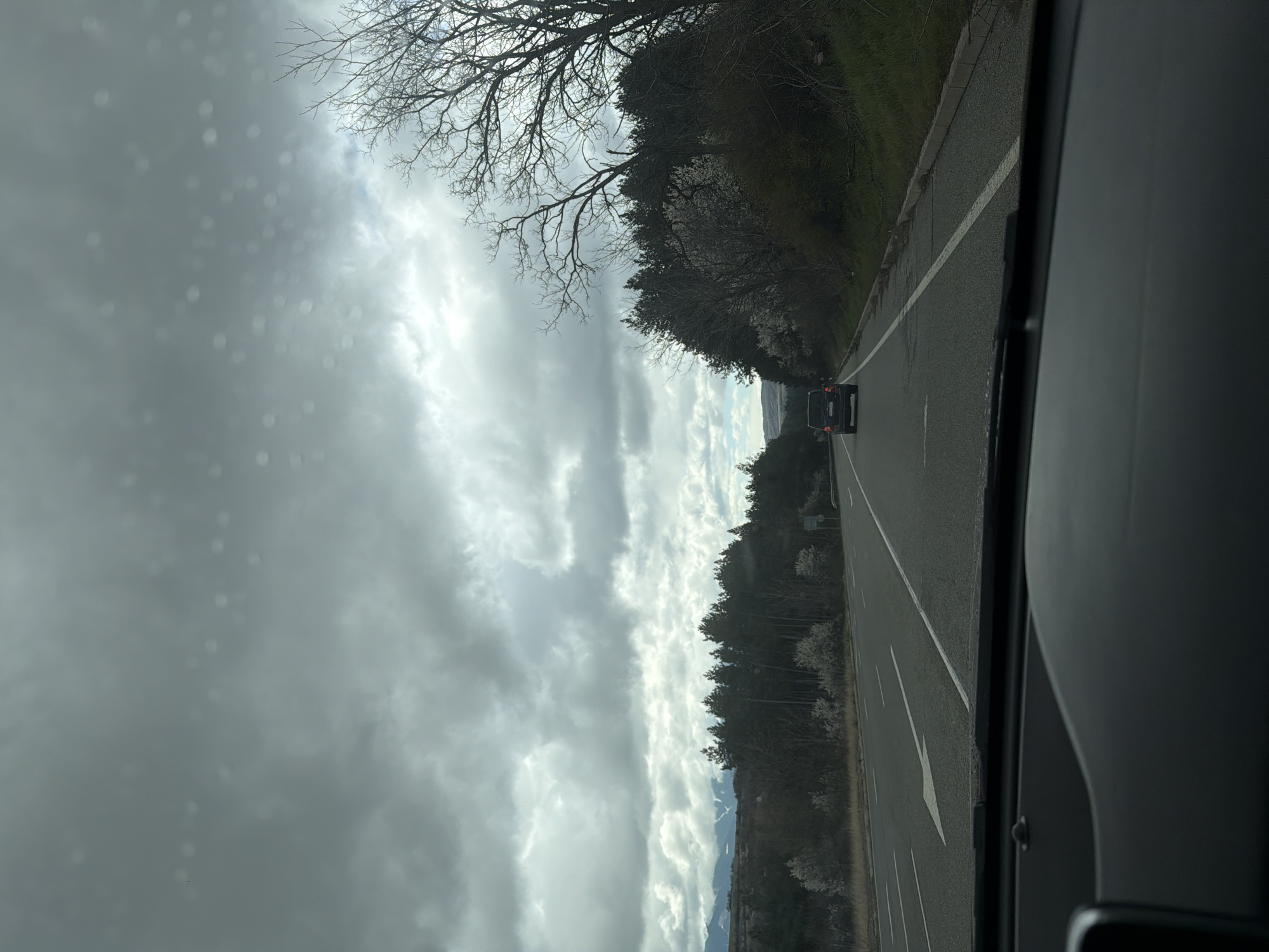 view from inside a car, looking out onto a road under a cloudy sky. The road has a white line dividing the lanes and an arrow painted on the asphalt. A dark-colored car is visible further down the road. Trees line the side of the road, and in the distance, hills or mountains can be seen. The scene appears to be outdoors. The image was not taken in Dyakovo, Bulgaria.