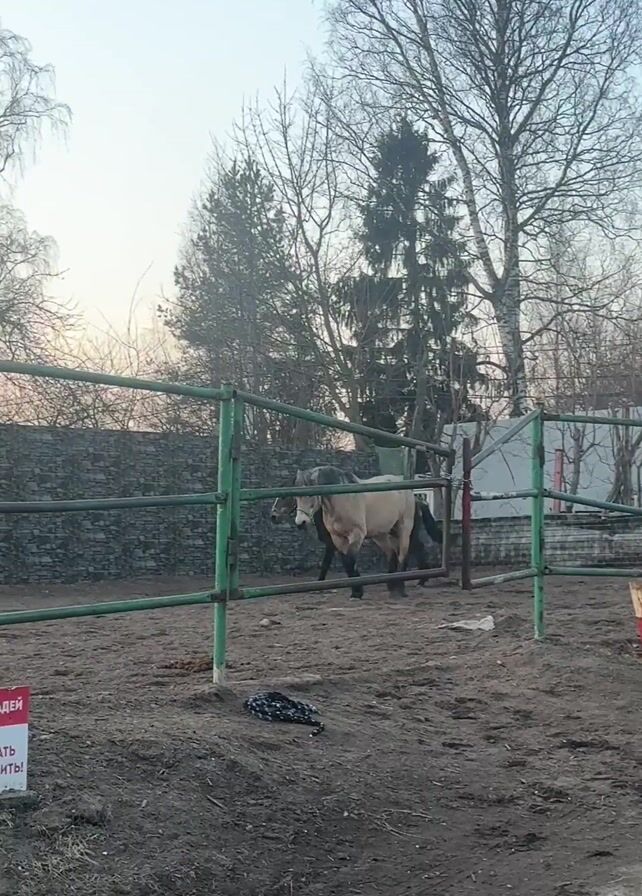 Two horses are in a fenced dirt enclosure. One is a light tan color and the other is dark brown. There is a sign that reads, "ПРОСИМ ЛОШАДЕЙ НЕ ТРОГАТЬ И НЕ КОРМИТЬ!" which translates to "PLEASE DO NOT TOUCH OR FEED THE HORSES!" The fence is made of green metal bars. There are trees and a stone wall behind the fence.
