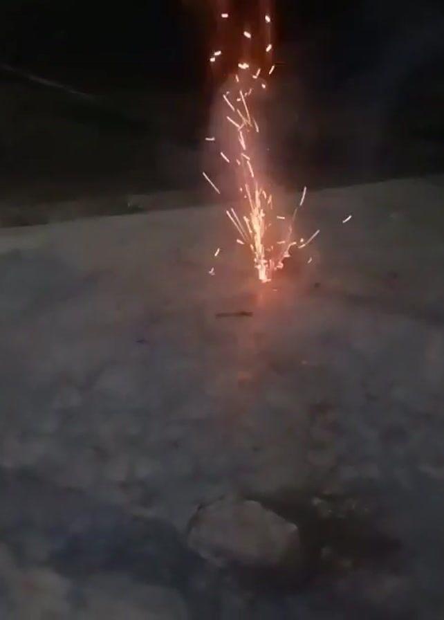 fireworks going off at night. Initially, a small spark ignites, followed by a rapid burst of sparks and bright light accompanied by smoke. The sparks shoot outwards, creating a dazzling display. The fireworks are on a concrete surface outdoors, and the surrounding area is dark. The video captures the moment of ignition, the intense burst of light and sparks, and the subsequent fading of the display.