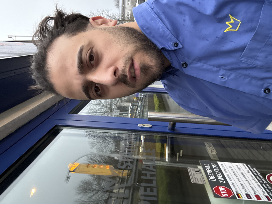 - "A selfie shows a man with dark hair and a beard, wearing a blue button-down shirt with a yellow crown logo, standing in front of a glass door" by FM-xKTK43, licensed under CC BY 4.0