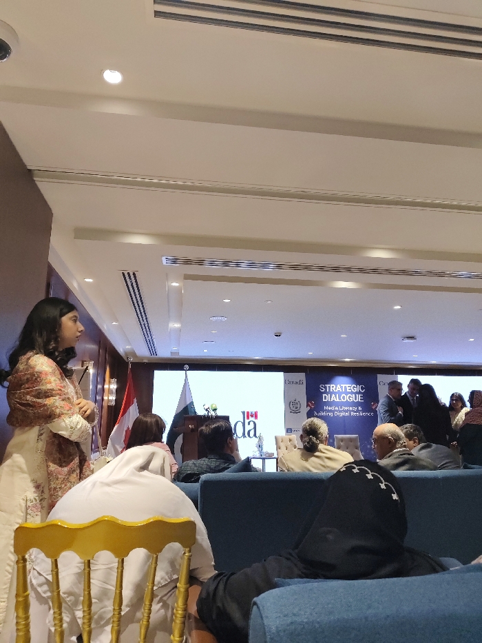 The image captures an indoor strategic dialogue event, likely held at a conference facility or hotel in Islamabad, Pakistan. The scene is illuminated by numerous recessed spotlights in a white paneled ceiling, which also features linear air conditioning vents and a ceiling-mounted security camera in the upper left. In the foreground left, a female subject stands in profile, facing right. She has dark, wavy hair and wears a light-colored traditional dress (shalwar kameez) with an elaborately patterned, multi-colored shawl draped over her shoulders. Her hands are clasped in front of her. The midground and foreground right are occupied by seated audience members on blue upholstered sofas. One subject in the immediate foreground right is viewed from behind, wearing a black abaya with white embroidered detailing on the hood. Adjacent to them, part of a golden-backed wooden chair is visible, partially obscuring another person dressed in light attire. Further back, several individuals are seated, facing towards the event stage. The background features a large, brightly lit screen serving as the stage backdrop. The screen displays the event title, "STRATEGIC DIALOGUE," with the subtitle "Media Literacy & Building Digital Resilience." Logos for "Canada" (featuring a maple leaf) and a partially visible "UNOPS" are also displayed. To the left of the screen, a flag of Pakistan and a Canadian flag are mounted on stands. Several individuals are visible standing and interacting on the stage area in front of the screen, including one male subject in a dark suit. The left wall features brown paneling and decorative wall sconces.