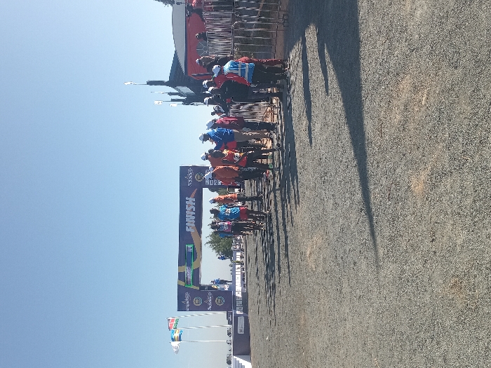 A horizontal shot captures a crowd of people gathered at the finish line of a race or event. A "FINISH" banner is prominently displayed. Participants wear athletic attire and caps. The Sierra Leone flag is visible in the foreground. The event is held outdoors, likely on a gravel or dirt surface. The scene is sunlit, with shadows of the crowd stretching across the ground.