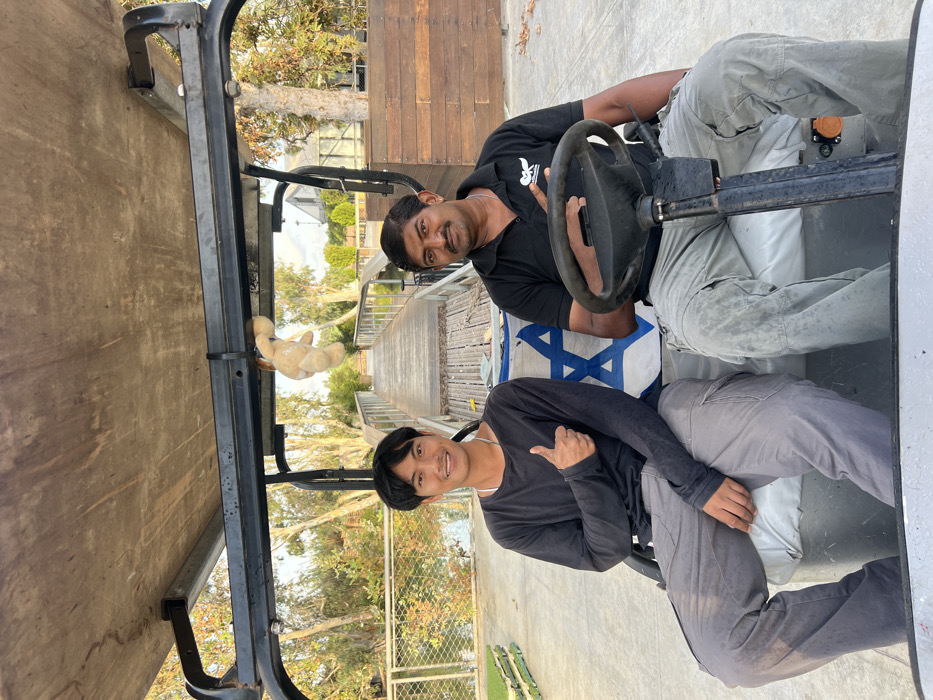 Two adult males are seated side-by-side in the front of a gray utility vehicle, identified as a golf cart, outdoors in Ga'ash, Israel. The vehicle features a wooden roof, from which a light brown stuffed animal resembling a teddy bear is suspended by a black zip tie. A small Israeli flag is visible, tucked into the seat between the two occupants. The male on the left, appearing to be of East Asian descent, wears a dark long-sleeved shirt and gray cargo pants. He is smiling and presents a thumbs-up gesture with his right hand. The male on the right, appearing to be of South Asian descent, has a mustache and wears a black short-sleeved polo shirt with a white logo on the left chest, and light gray cargo pants. He is positioned behind the vehicle's black steering wheel, smiling, and has his right hand raised in a relaxed gesture. The immediate foreground is concrete pavement. The background features a body of water with a metal fence and stacked green artificial turf mats on the left, leading to dense foliage. A wooden pedestrian bridge with metal railings extends over the water centrally, towards the background. To the right, a building with dark horizontal siding and additional trees are visible under a partly cloudy sky.