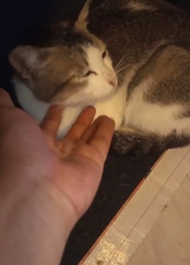 A person's hand strokes a sleeping cat. The cat is curled up on a dark, possibly padded, surface. It has white fur on its chest and grey and brown fur on its back. The cat's eyes are closed and it appears to be relaxed. A corner of a white and grey striped surface is visible at the bottom of the frame, possibly a tarpaulin or similar material. The lighting is subdued, with shadows around the scene.