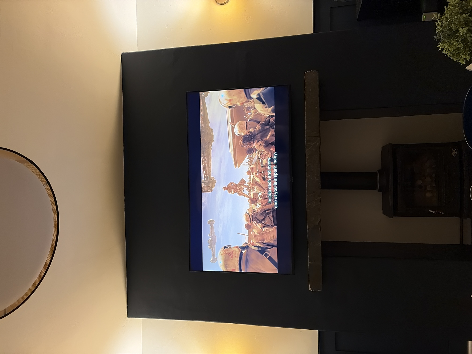 This image depicts an indoor scene, likely a living room, located in Windermere, United Kingdom. A flat-screen television is centrally mounted on a dark, possibly charcoal-colored, chimney breast wall. The television displays a vibrant outdoor scene: a desert landscape under a clear blue sky, populated by numerous figures in tactical or futuristic attire, some wearing helmets. A prominent figure, appearing to wear a wide-brimmed hat, stands elevated on the screen's right side. Several flying vehicles are visible in the sky above. White subtitles at the bottom of the screen read: "Inside each and every one of you is a spark, baby." Below the television, a rustic, rough-hewn stone mantelpiece extends horizontally. Beneath the mantelpiece, a black, freestanding wood-burning stove with a glass door, revealing glowing embers or faux logs, is situated within a fireplace recess. A black stovepipe extends upwards from the stove. The surrounding walls are off-white, with a wall-mounted light fixture emitting a warm glow on the right. The off-white ceiling features a partially visible large, circular light fixture with a textured, golden-brown rim. A small section of a green potted plant is visible in the bottom right corner of the frame.