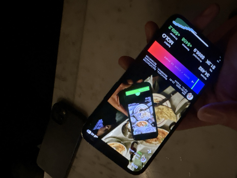 A human hand holds a black smartphone displaying a complex interface. The primary image on the screen shows a top-down view of several small dishes containing food, possibly Indian cuisine with naan bread, which is being photographed by another horizontally-held smartphone visible within the frame. Overlaid on the screen's lower left, text indicates "SDO 03/02/2026, 23:01," and specifies the location as "Paris, France." Further overlaid text includes mood descriptors such as "Nostalgia, Satisfaction, Abundance, Contentment, Relaxation," and financial or application data showing "Symbol MQLO," "Creator +$69.2," "Options 34,492," "Revenue +$458," and "TGL $1.3K $856.9," accompanied by a small green line graph. In the blurred background, another dark-colored smartphone rests on a light-colored surface, likely a tabletop. The scene is dimly lit.