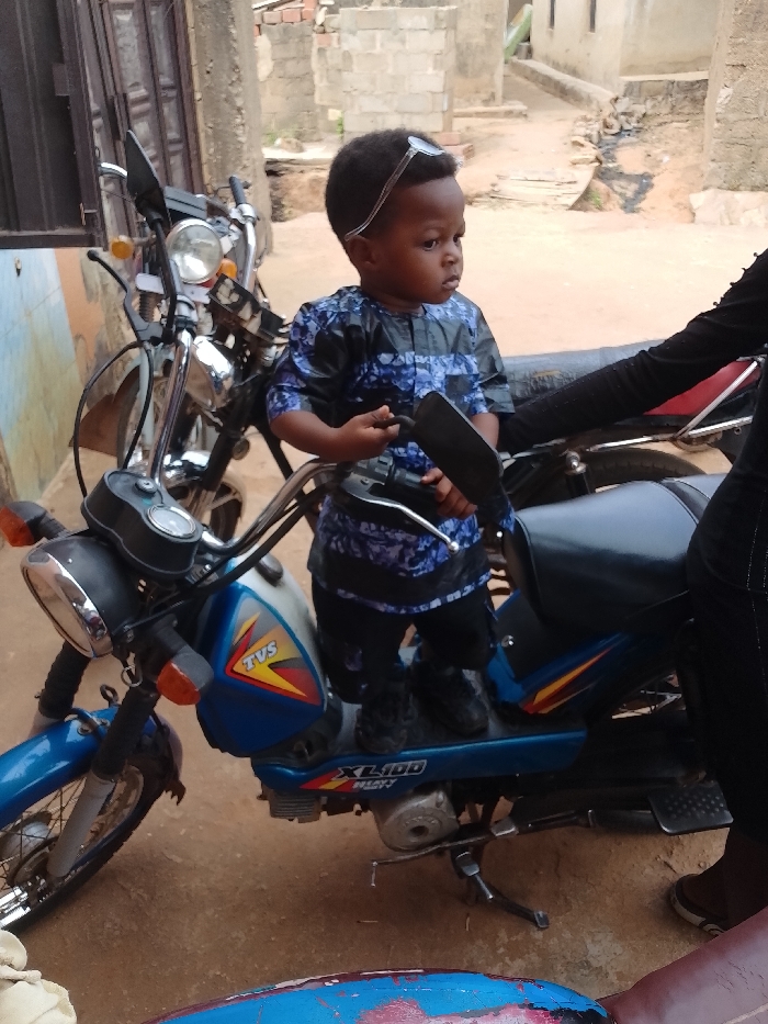 The scene depicts an outdoor setting in the city of Television, Nigeria. A young child, appearing to be a toddler, stands on the footboard of a blue TVS XL100 Heavy Duty motorcycle. The child has dark hair, wears clear-framed sunglasses perched on their head, a blue and black patterned shirt, dark pants, and dark shoes, gripping the handlebars/rearview mirrors and looking towards the right. A partially visible adult arm, dressed in black, is positioned near the rear of the motorcycle. Another, largely obscured, silver-colored motorcycle is visible in the background behind the primary vehicle. The ground is unpaved, reddish-brown dirt. In the background, there are weathered buildings constructed from concrete blocks, with a brown wooden door visible to the left.