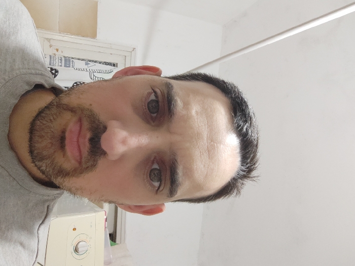 A man with a light complexion and short, dark hair looks directly at the camera. He has a neatly trimmed beard, and his eyes are a light brown. He is wearing a gray sweatshirt. The background features white walls and a partial view of what appears to be a washing machine and other domestic items. A white molding runs along the top right of the image. The photograph is taken from a slightly skewed angle.