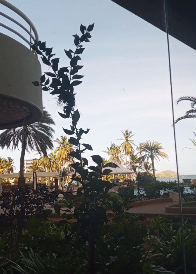 view from inside a building looking out towards a tropical landscape. The foreground of the shot features a leafy plant, partially obscuring the view. Beyond the plant, there's a meticulously landscaped garden with various plants and what appears to be a path. In the background, numerous palm trees punctuate the skyline against a clear, light blue sky. In between the palm trees there is a view of a sea and small island. The video is shot through a glass window. There are light reflections on the window, indicating indoor lighting. Sounds of distant music can be heard in the background, suggesting some activity nearby.