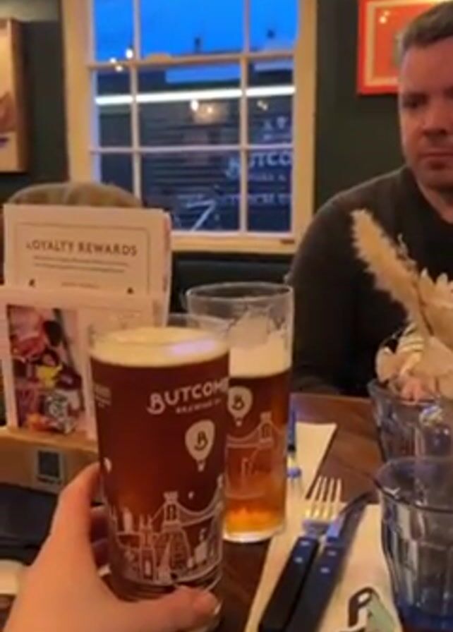 table in a pub, with two pints of beer. The pint in the foreground is a Butcombe beer, and the glass has a Bristol cityscape design. A man is sitting at the table, to the right of the beers, looking straight ahead. The lighting is dim and there is a loyalty rewards card stand on the table. Outside the window behind the table, it appears to be dusk or early evening. The camera is handheld and moves slightly, and the hand of the person holding the camera is seen near the pint glass. There are cutlery and a napkin on the table as well. The overall atmosphere appears relaxed and casual.