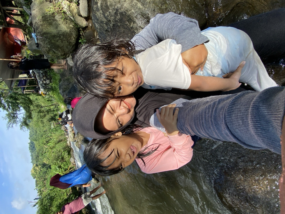 A selfie captures a woman in a black hijab with two young girls. The girl in a white top and grey sleeves clings to the woman from above. The second girl, wearing pink, smiles broadly from below. They appear to be in a shallow stream, with water visible in the foreground. Lush greenery and other people are blurred in the background. The photo is taken at a tilted angle, emphasizing the close bond between the subjects.
