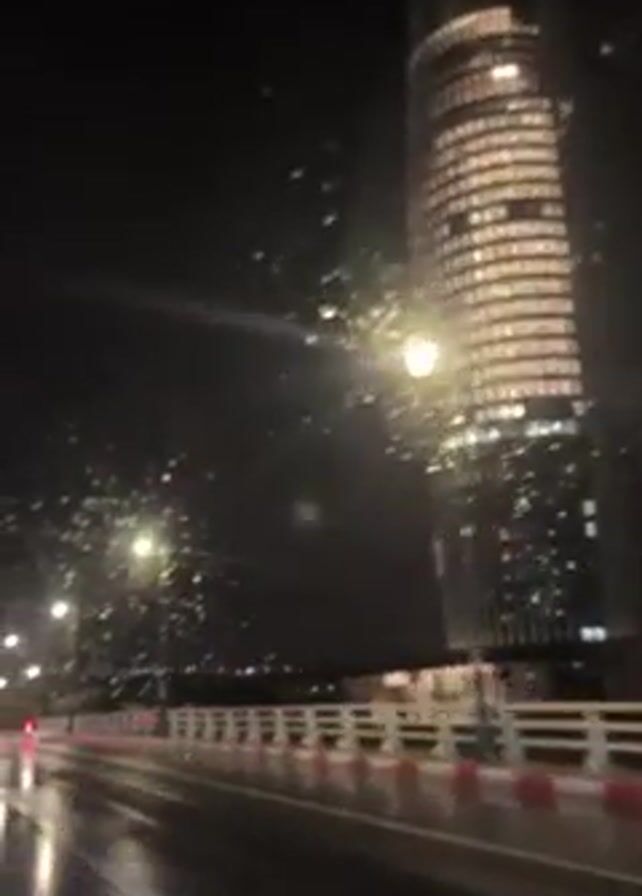 car driving on a wet road at night. The bright lights of a tall, modern skyscraper are visible to the right of the road, and are reflected in the puddles on the surface. The road is lined with streetlights and a low barrier. The view is from inside the car, through the windshield, which has raindrops on it. The overall scene is dark and rainy. Music is playing.