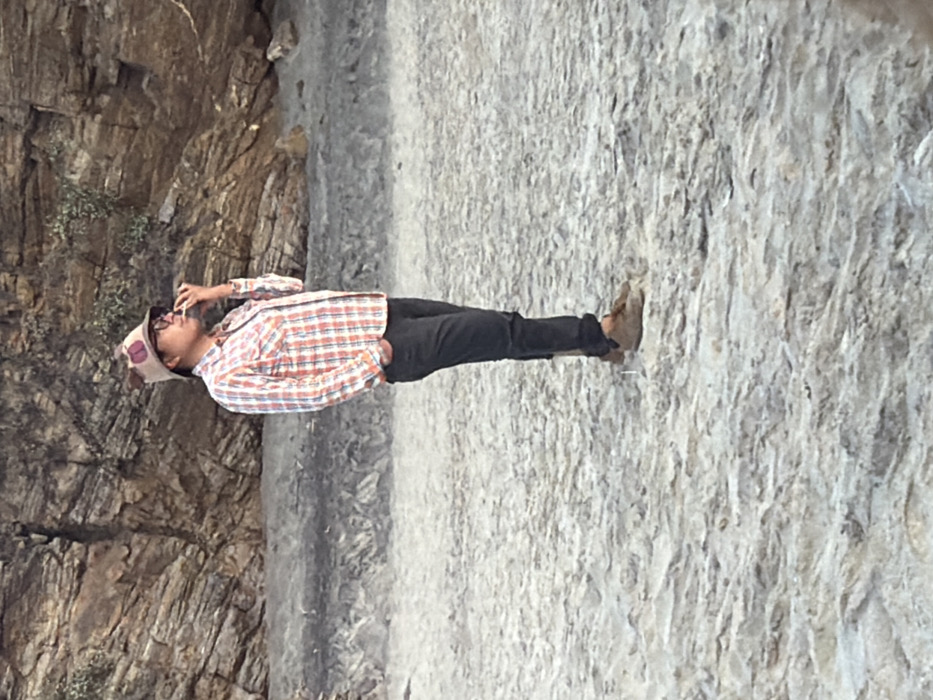 A person stands in front of a rugged, rocky landscape. They wear a plaid shirt, dark pants, and a patterned hat, and have glasses on. They appear to be taking a picture with their phone. The background consists of a textured, stone wall on one side and a steep, rocky cliff on the other. The overall scene suggests an outdoor or natural environment.
