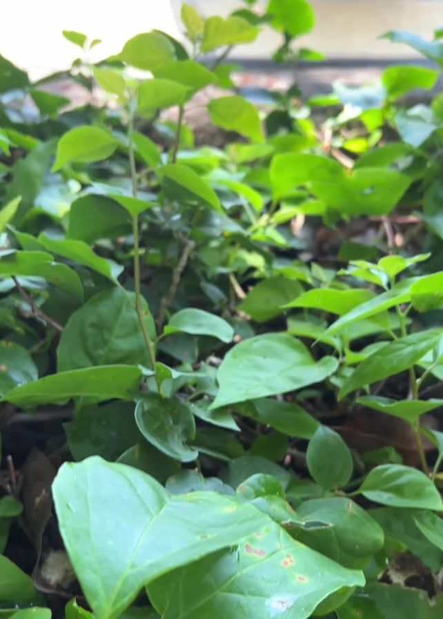 The camera pans up from a patch of lush green ground cover to reveal a zoo enclosure with two white tigers resting