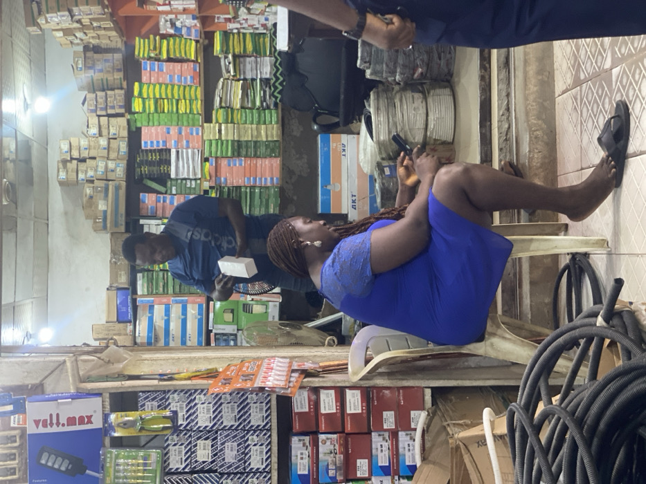 Inside a shop, a woman in a blue dress sits on a chair looking at her phone. A man in an Adidas shirt stands beside her examining a small white box. Shelves filled with electrical components and supplies line the walls. Boxes and black cables clutter the floor space. Another man, partially visible, stands nearby. The scene conveys a casual shopping or browsing environment.