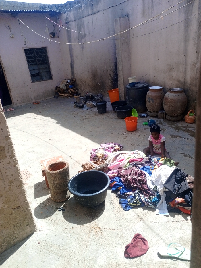 This image depicts an outdoor courtyard scene in Dabawa, Nigeria, under bright daylight