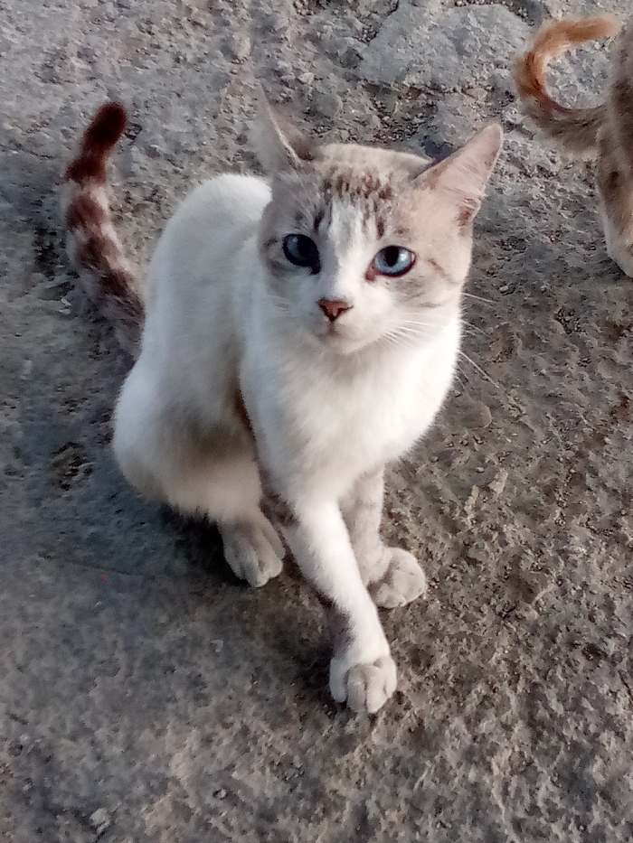 This forensic description details a scene in Las Guevaras, Venezuela. A white domestic cat with faint light brown and grey tabby markings on its head, ears, and a striped tail is the primary subject. The cat is seated upright on a textured, grey concrete or paved surface, with its front right paw extended forward. It has prominent bright blue eyes and a pink nose, looking directly towards the viewer. The curled tail and a portion of the body of a second furbearer are visible on the right side of the frame. The lighting indicates daylight conditions.