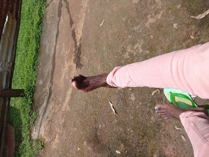 The image presents a low-angle view of an individual's lower legs and feet. The subject's skin tone is dark brown. They wear light pink trousers. The left foot, bare, has light blue nail polish on the big toe and is positioned next to a green flip-flop on a mottled brown and grey dirt ground. Several dry leaves are scattered on this surface. The right foot is elevated, with its sole facing the viewer. In the background, a strip of green vegetation is visible behind a vertical wooden post, which partially obscures a weathered corrugated metal sheet. The scene is outdoors under natural daylight. The specific location within Kisii, Kenya, is not visually identifiable from the provided image.