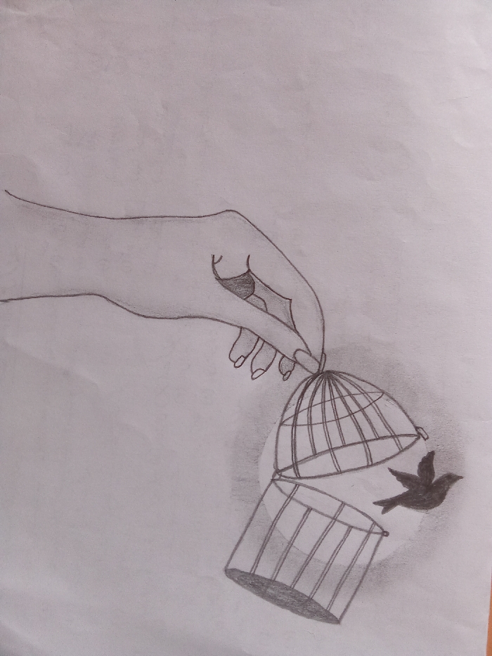 The image is a monochrome pencil drawing rendered on light-toned paper. It depicts a left human hand, partially visible, extending from the left upper-middle of the frame. The hand holds the domed, upper section of an open birdcage by its apex, with the thumb and forefinger. The lower, cylindrical section of the birdcage rests below the upper part. Both sections are drawn with intersecting lines representing bars. To the right of the open birdcage, a small, dark-shaded bird is depicted in flight, appearing to emerge from or fly away from the cage opening. Subtle shading is present on the bird, within the base of the cage, and around the hand and cage to suggest depth. The background is an undifferentiated, light-colored paper surface. No specific physical location in the city of Quetta, Pakistan, or any other geographical area, is depicted or discernible within the artwork itself.