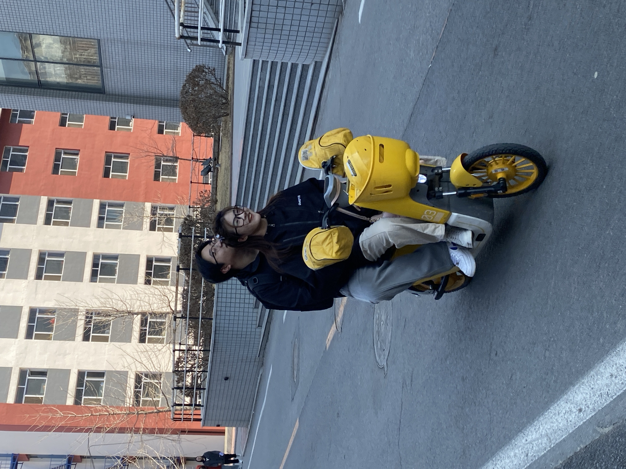In Zhongtun, China, a couple is on a yellow electric scooter, parked on an asphalt surface with a white dividing line. The man is driving; he wears a black jacket and a black beanie. The woman, sitting behind him, is wearing glasses and a black jacket. The building in the background is a mix of gray, white, and red brick, with many windows. Bare tree branches are visible in front of the building. A set of stairs is partially visible behind the couple. In the lower left corner, two individuals walk on the sidewalk.
