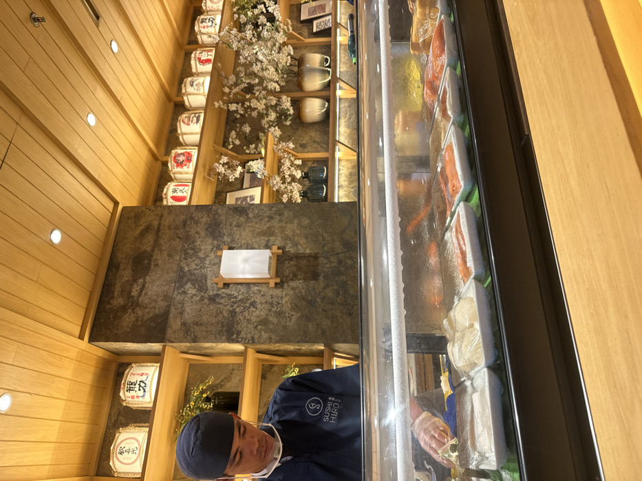 - "A sushi chef in a blue uniform is preparing food in front of a refrigerated display case stocked with packaged fish" by FM-dya8j2, licensed under CC BY 4.0