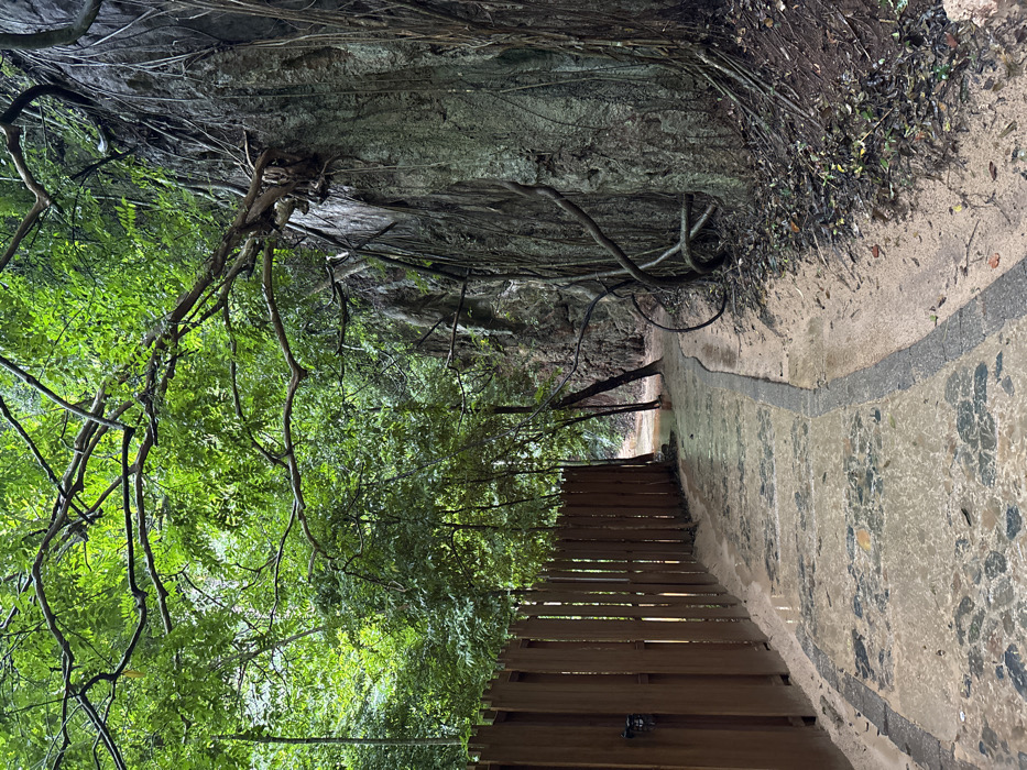 The image displays a paved pathway in a verdant, tropical environment in Ao Nang, Thailand. The path, constructed from irregular dark stones embedded in lighter concrete, appears wet and reflects ambient light, suggesting recent precipitation. It curves gently from the foreground towards the mid-ground, receding into the distance. On the left side, a tall wooden fence with vertical planks runs parallel to the path. A dark metal latch mechanism is visible on one of the fence planks in the immediate foreground. The fence extends into the mid-ground, delineating a boundary. To the right of the pathway, a rugged limestone cliff face rises abruptly. Its surface is textured, with areas of exposed rock, moss, and numerous dark vines and aerial roots clinging to its surface, some descending to the sandy ground at its base. The ground immediately adjacent to the path on the right consists of light-colored sand mixed with dark leaf litter. Overhead, a dense canopy of lush green tropical foliage from various trees creates a shadowed, dappled lighting effect on the scene. Prominent thick tree branches extend horizontally across the upper frame, some appearing to grow directly from the rock face. No individuals, animals, or human-made objects other than the fence and pathway are visible within the frame. The scene is illuminated by natural light filtered through the dense foliage.