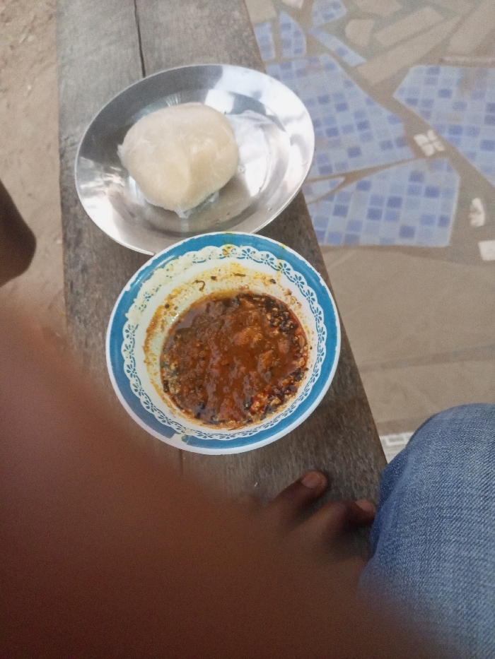 A meal of smooth, white fufu is presented on a silver plate. Beside it, a blue-rimmed bowl holds a rich, dark sauce, possibly a stew or soup. Both items are placed on a weathered wooden surface. Part of a person is visible at the bottom right, dressed in denim jeans, and a dark-skinned arm and hand are on the lower left. The background shows hints of a patterned tile surface.