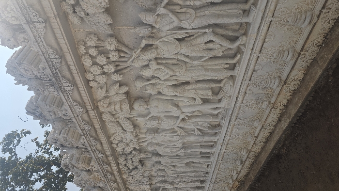 Stone carving depicts a procession of figures, seemingly in bas-relief