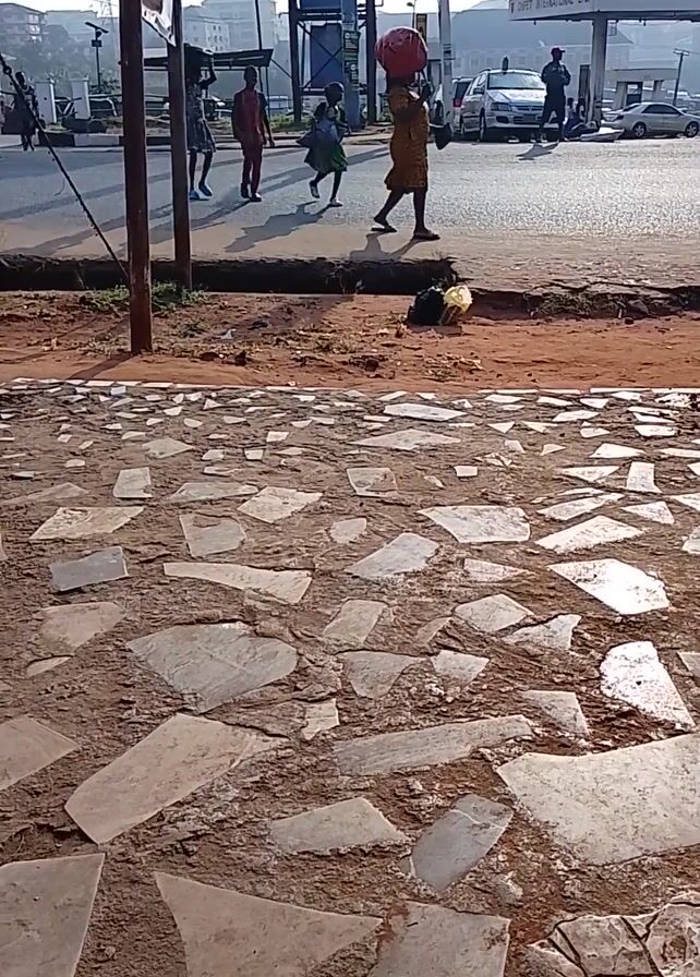 The scene captures a street view from a low angle, focusing on a uniquely paved sidewalk made of irregular, light-colored stones embedded in earth. In the background, a busy street is visible, with several people crossing the road. One woman carries a large red item on her head. Vehicles, including cars and a three-wheeled vehicle, are seen parked at a gas station. The day appears bright, with the sun casting shadows and highlighting the texture of the stone sidewalk.